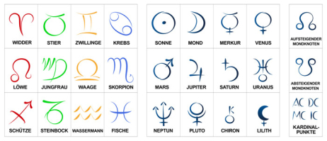 Symbole für die Tierkreiszeichen und Planeten: